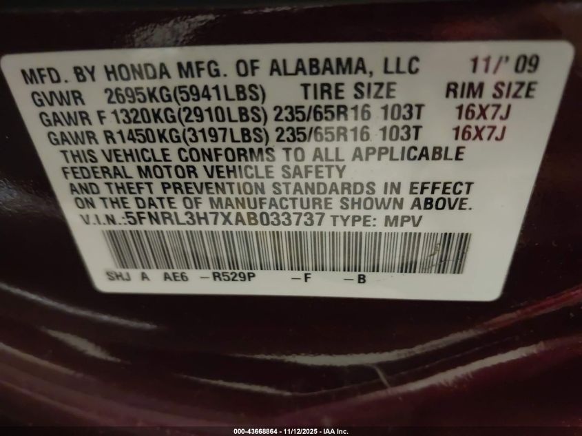 Цвет БордовыйЦилиндры 6Привод Передний приводVIN 5FNRL3H7XAB033737Состояние СтационарноПовреждения Механические повреждения AutoRIA