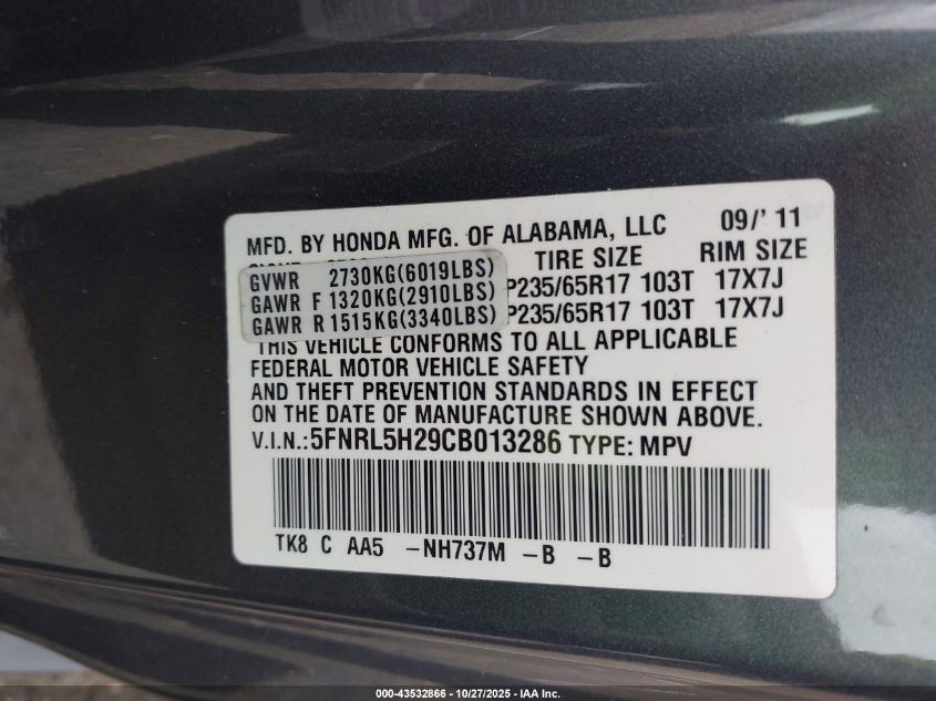 Цвет СерыйЦилиндры 6Привод Передний приводVIN 5FNRL5H29CB013286Состояние СтационарноПовреждения Незначительные AutoRIA
