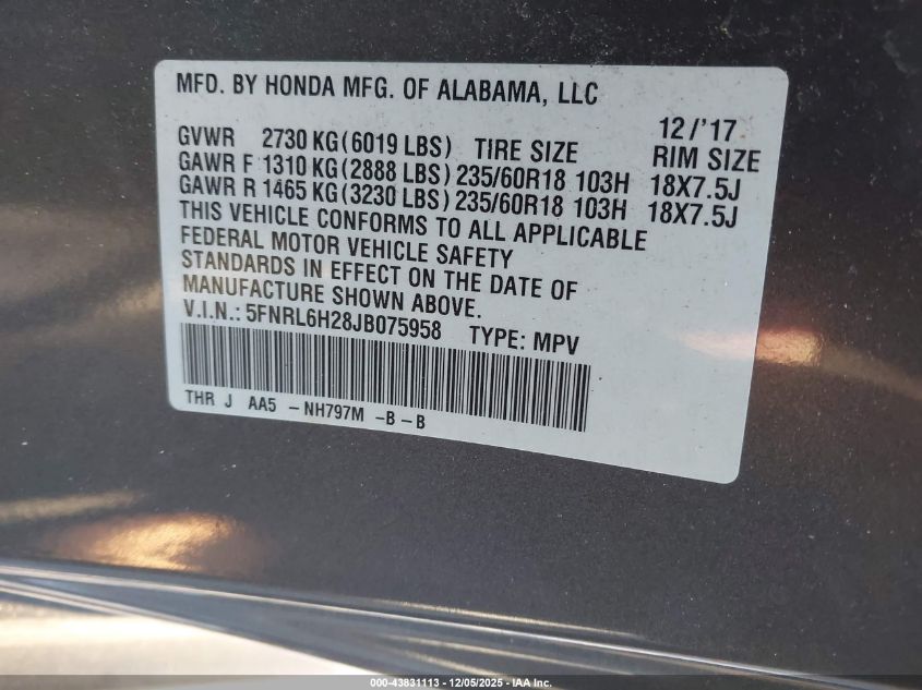 Цвет СерыйЦилиндры 6Привод Передний приводVIN 5FNRL6H28JB075958Состояние Заводится и едет (проверено)Повреждения Неизвестно AutoRIA