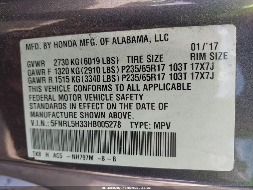Цвет СерыйЦилиндры 6Привод Передний приводVIN 5FNRL5H33HB005278Состояние СтационарноПовреждения Передняя или задняя AutoRIA