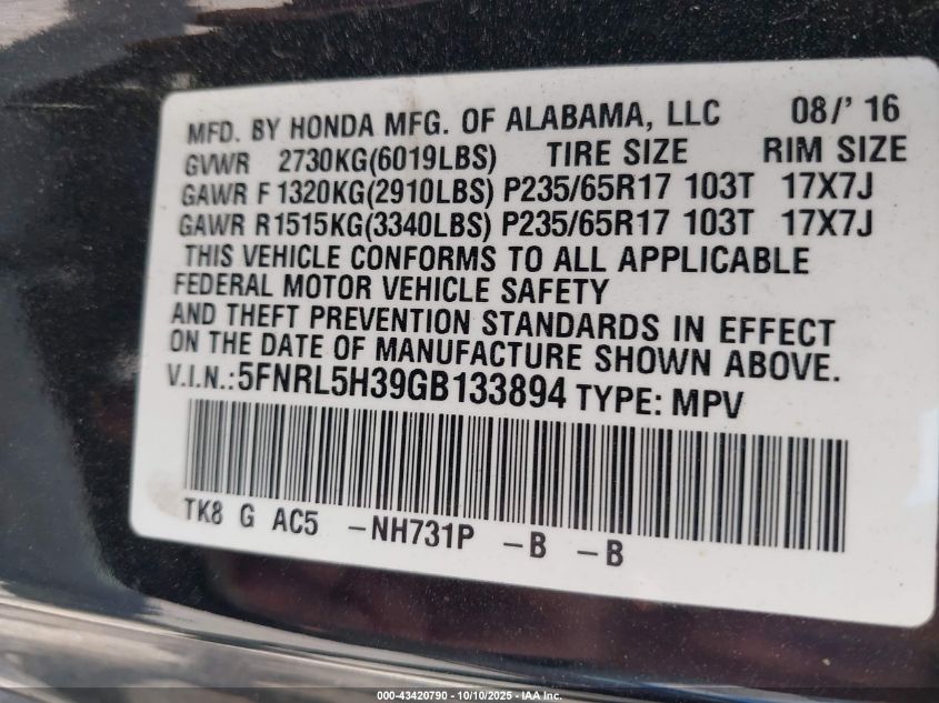 2016 HONDA ODYSSEY 2016 року Бензин, 3.5, Передний привод, vin - 5FNRL5H39GB133894 из США