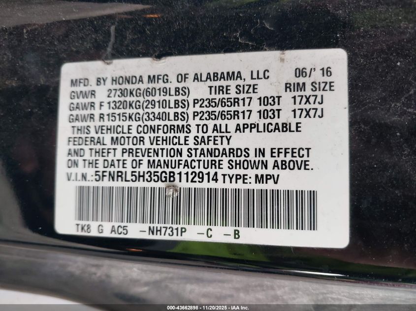 Цвет ЧерныйЦилиндры 6Привод Передний приводVIN 5FNRL5H35GB112914Состояние Заводится и едет (проверено)Повреждения Передняя или задняя AutoRIA