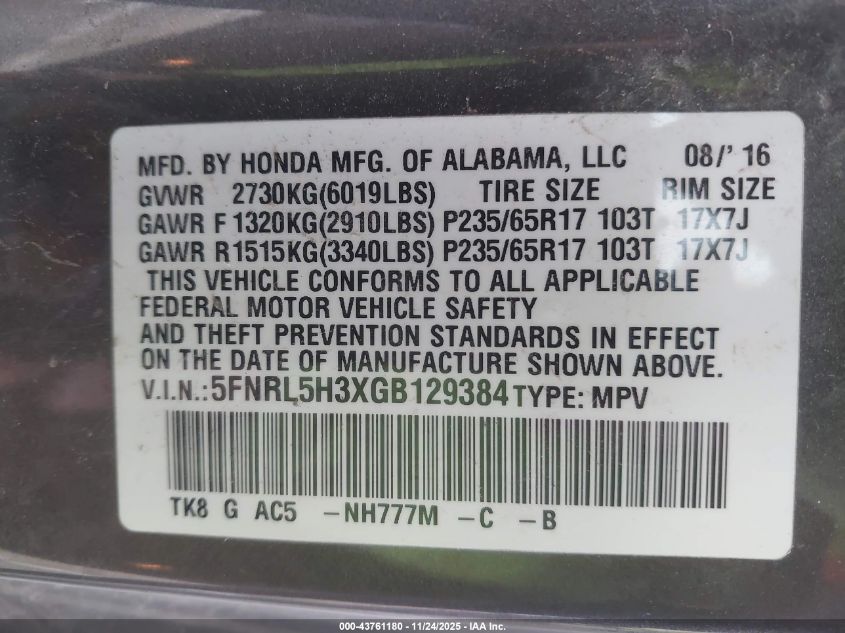 Цвет СерыйЦилиндры 6Привод Передний приводVIN 5FNRL5H3XGB129384Состояние Заводится и едет (проверено)Повреждения Передняя или задняя AutoRIA