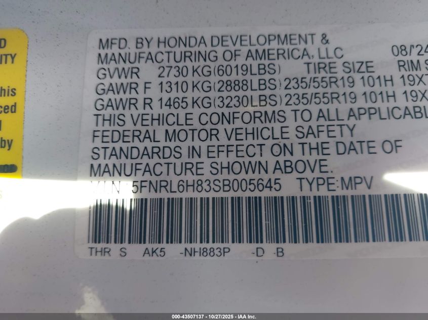 2025 HONDA ODYSSEY 2025 року Бензин, 3.5, Передний привод, vin - 5FNRL6H83SB005645 из США