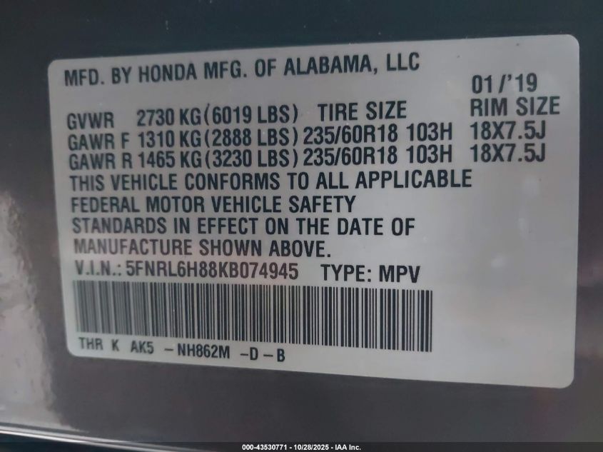 Цвет СерыйЦилиндры 6Привод Передний приводVIN 5FNRL6H88KB074945Состояние СтационарноПовреждения Передняя правая AutoRIA