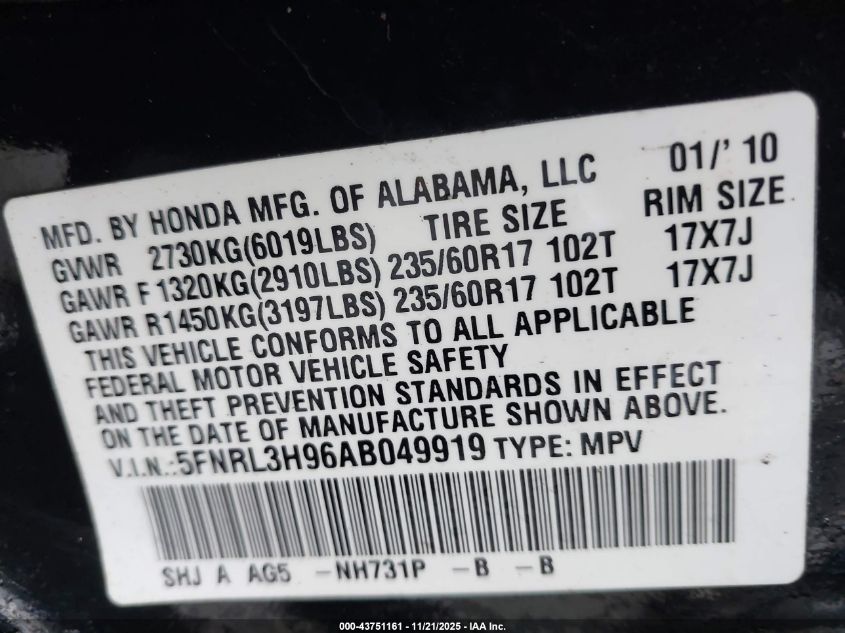 Цвет ЧерныйЦилиндры 6Привод Передний приводVIN 5FNRL3H96AB049919Состояние СтационарноПовреждения По бокам AutoRIA