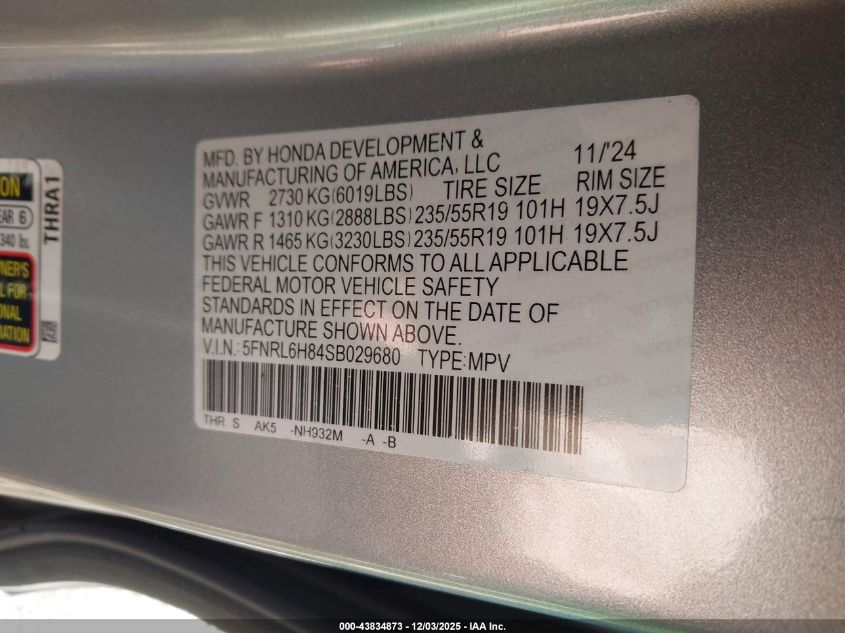 Цвет СеребряныйЦилиндры 6Привод Передний приводVIN 5FNRL6H84SB029680Состояние СтационарноПовреждения Передняя левая