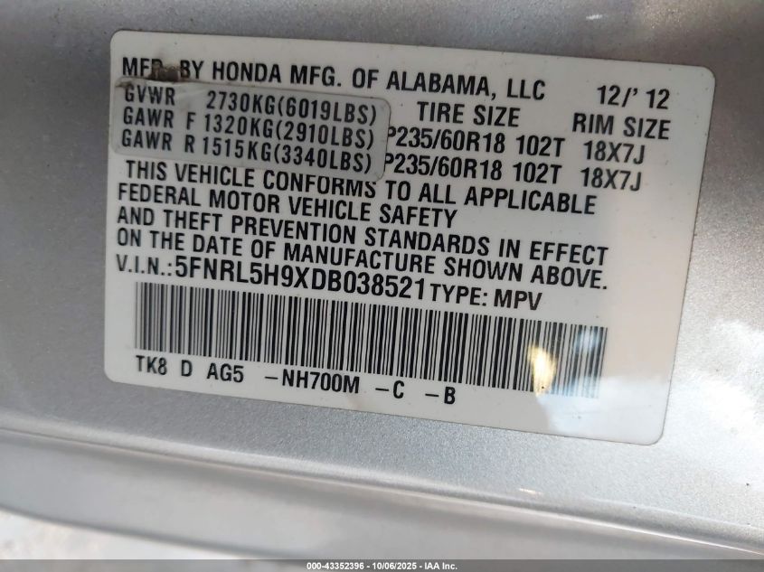 Цвет СеребряныйЦилиндры 6Привод Передний приводVIN 5FNRL5H9XDB038521Состояние СтационарноПовреждения Передняя и задняя AutoRIA