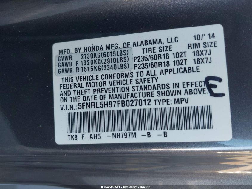 2015 HONDA ODYSSEY 2015 року Бензин, 3.5, Передний привод, vin - 5FNRL5H97FB027012 из США