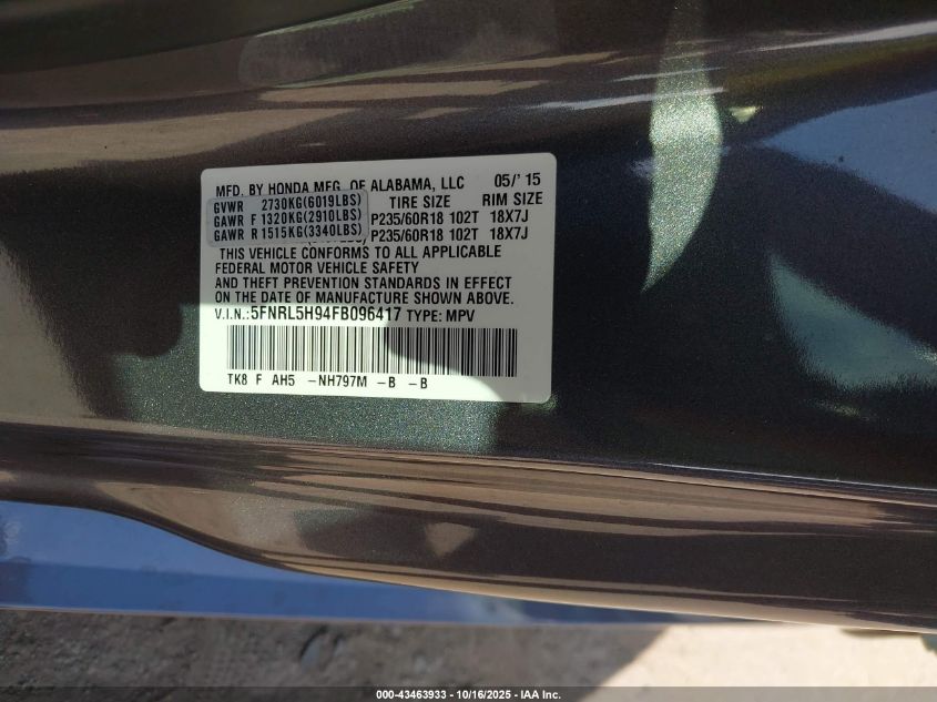 2015 HONDA ODYSSEY 2015 року Бензин, 3.5, Передний привод, vin - 5FNRL5H94FB096417 из США