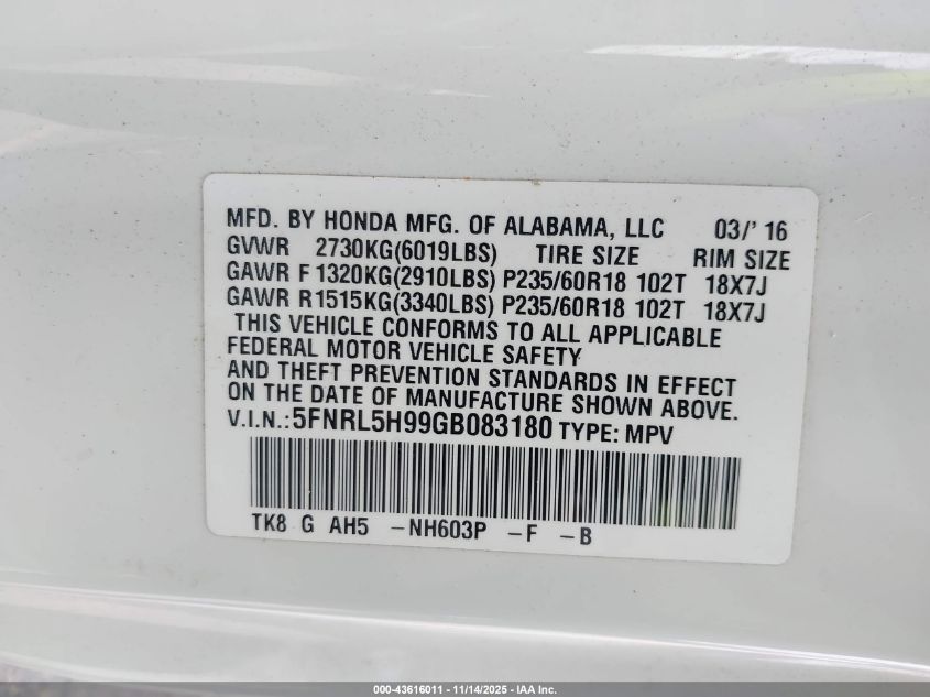 2016 HONDA ODYSSEY 2016 року Бензин, 3.5, Передний привод, vin - 5FNRL5H99GB083180 из США