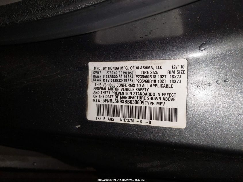 Цвет СерыйЦилиндры 6Привод Передний приводVIN 5FNRL5H9XBB030609Состояние Заводится и едет (проверено)Повреждения Левая сторона AutoRIA