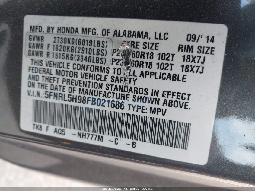 2015 HONDA ODYSSEY 2015 року Бензин, 3.5, Передний привод, vin - 5FNRL5H98FB021686 из США