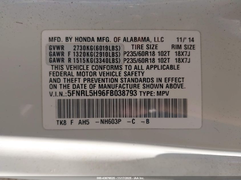 2015 HONDA ODYSSEY 2015 року Бензин, 3.5, Передний привод, vin - 5FNRL5H96FB038793 из США