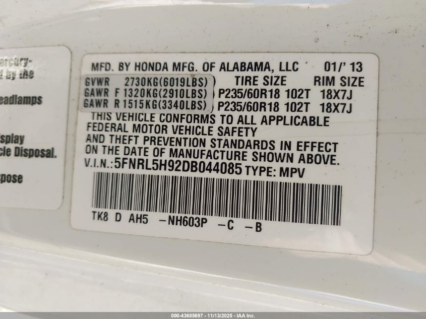 Цвет БелыйЦилиндры 6Привод Передний приводVIN 5FNRL5H92DB044085Состояние СтационарноПовреждения Передняя или задняя AutoRIA