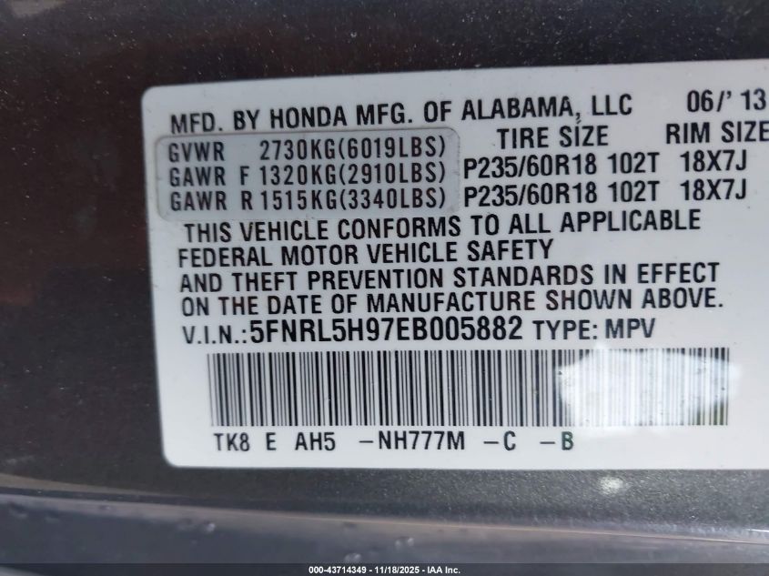 Цвет СерыйЦилиндры 6Привод Передний приводVIN 5FNRL5H97EB005882Состояние СтационарноПовреждения Передняя или задняя AutoRIA