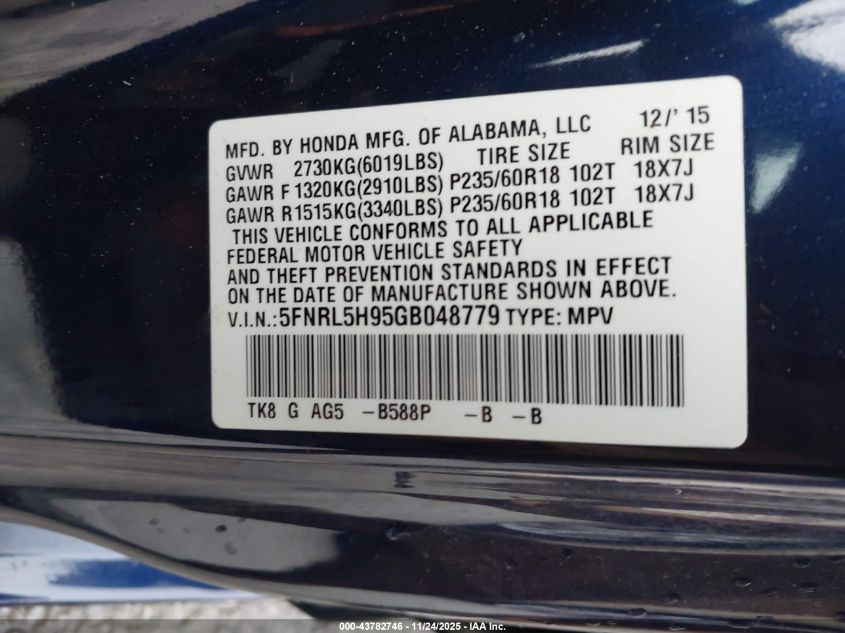 Цвет СинийЦилиндры 6Привод Передний приводVIN 5FNRL5H95GB048779Состояние Заводится и едет (проверено)Повреждения Левая сторона AutoRIA
