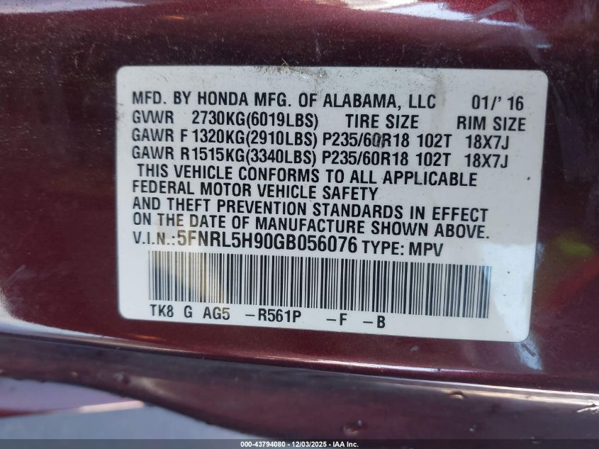 2016 HONDA ODYSSEY TOURING