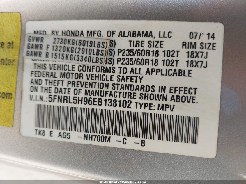 Цвет СеребряныйЦилиндры 6Привод Передний приводVIN 5FNRL5H96EB138102Состояние Заводится и едет (проверено)Повреждения Передняя левая AutoRIA