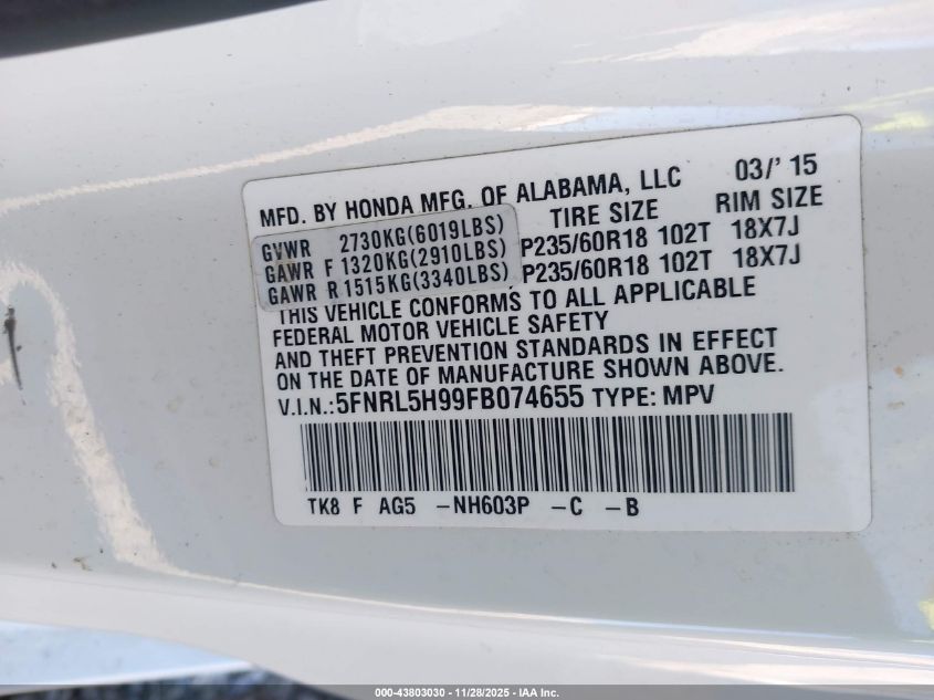 2015 HONDA ODYSSEY 2015 року Бензин, 3.5, Передний привод, vin - 5FNRL5H99FB074655 из США