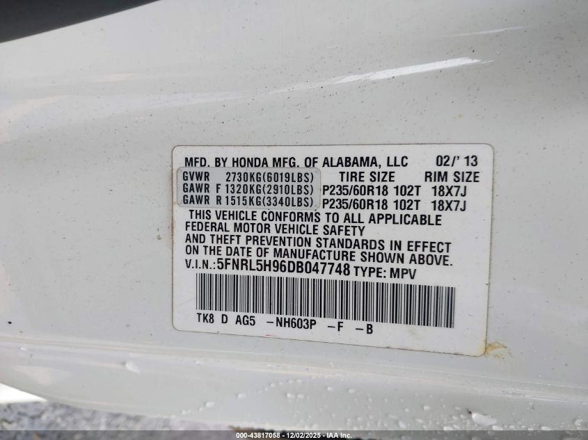 Цвет БелыйЦилиндры 6Привод Передний приводVIN 5FNRL5H96DB047748Состояние Заводится и едет (проверено)Повреждения Задняя AutoRIA