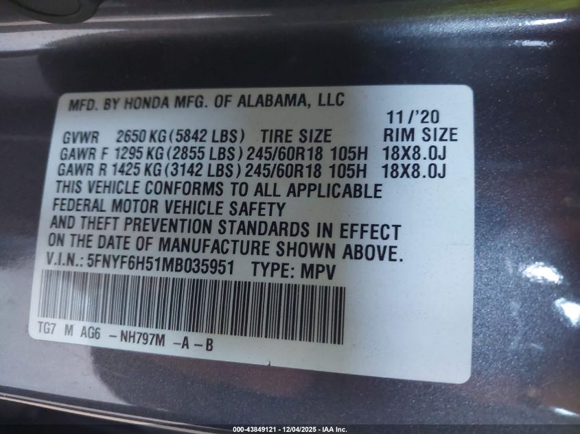 2021 HONDA PILOT 2021 року Бензин, 3.5, Полный привод, vin - 5FNYF6H51MB035951 из США