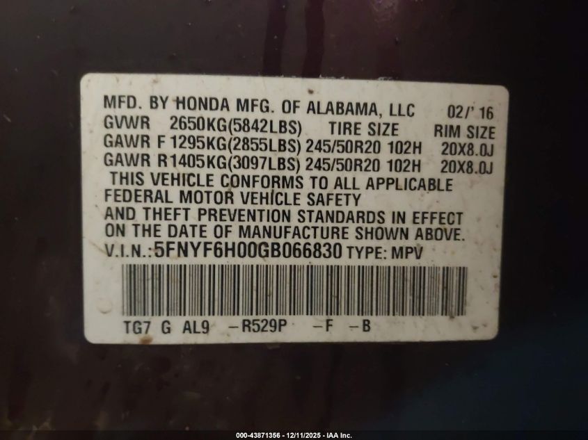 2016 HONDA PILOT 2016 року Бензин, 3.5, Полный привод, vin - 5FNYF6H00GB066830 из США