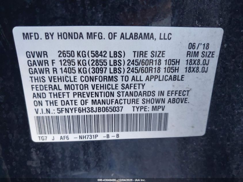 2018 HONDA PILOT 2018 року Бензин, 3.5, Полный привод, vin - 5FNYF6H38JB065037 из США