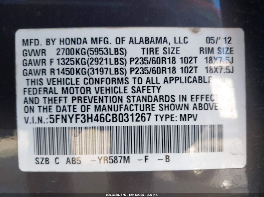 Цвет Цилиндры 6Привод Передний приводVIN 5FNYF3H46CB031267Состояние НеизвестноПовреждения Передняя или задняя AutoRIA