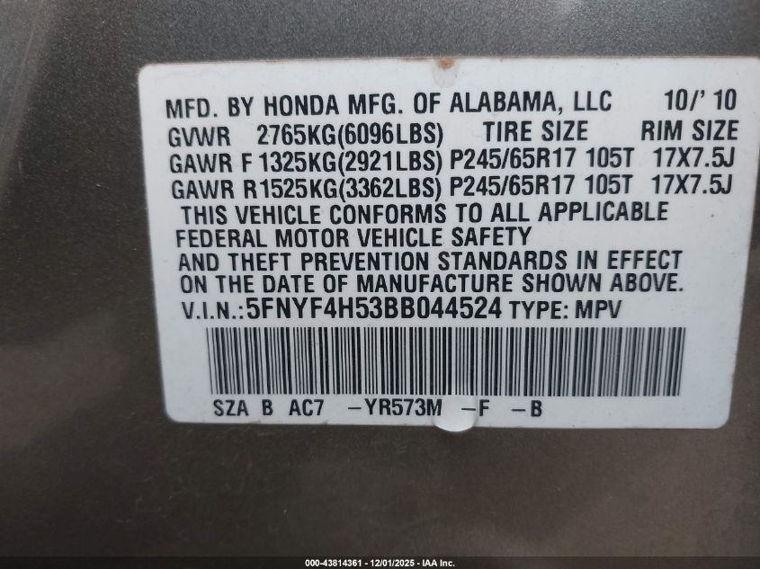 2011 HONDA PILOT 2011 року Бензин, 3.5, Полный привод, vin - 5FNYF4H53BB044524 из США