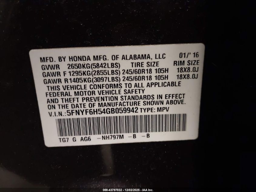 2016 HONDA PILOT 2016 року Бензин, 3.5, Полный привод, vin - 5FNYF6H54GB059942 из США