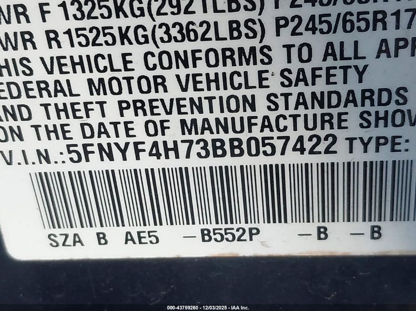 2011 HONDA PILOT 2011 року Бензин, 3.5, Полный привод, vin - 5FNYF4H73BB057422 из США