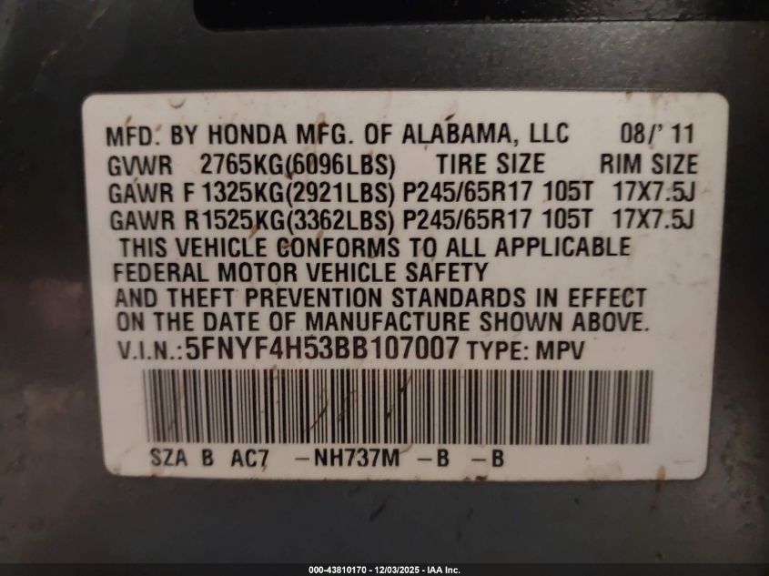 Цвет СерыйЦилиндры 6Привод Полный приводVIN 5FNYF4H53BB107007Состояние Заводится и едет (проверено)Повреждения Передняя или задняя AutoRIA