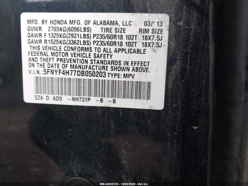 Цвет ЧерныйЦилиндры 6Привод Полный приводVIN 5FNYF4H77DB050203Состояние Заводится и едет (проверено)Повреждения Левая сторонаДата аукциона 2025-12-08 AutoRIA