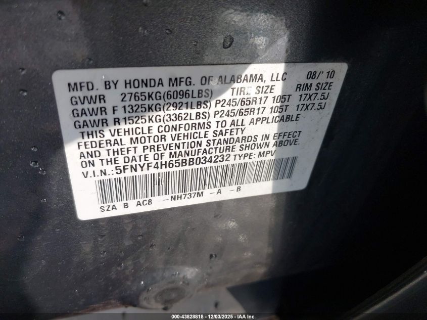 Цвет СерыйЦилиндры 6Привод Полный приводVIN 5FNYF4H65BB034232Состояние СтационарноПовреждения Передняя праваяДата аукциона 2025-12-09 AutoRIA