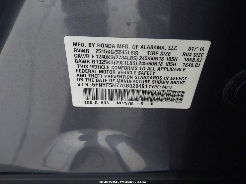 2016 HONDA PILOT 2016 року Бензин, 3.5, Передний привод, vin - 5FNYF5H77GB029491 из США