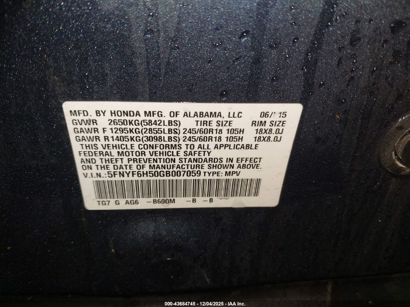 2016 HONDA PILOT 2016 року Бензин, 3.5, Полный привод, vin - 5FNYF6H50GB007059 из США