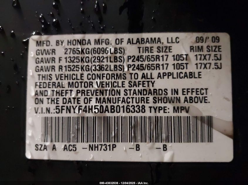 Цвет ЧерныйЦилиндры 6Привод Полный приводVIN 5FNYF4H50AB016338Состояние Заводится и едет (проверено)Повреждения Передняя левая AutoRIA