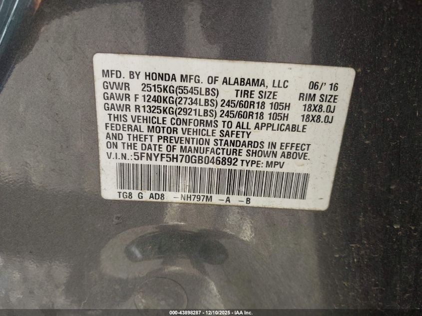 2016 HONDA PILOT 2016 року Бензин, 3.5, Передний привод, vin - 5FNYF5H70GB046892 из США