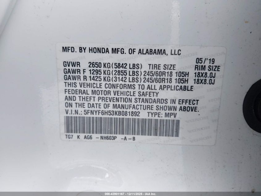 2019 HONDA PILOT 2019 року Бензин, 3.5, Полный привод, vin - 5FNYF6H53KB081892 из США