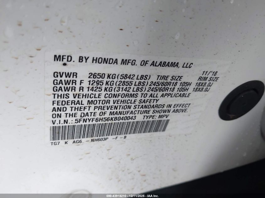 2019 HONDA PILOT 2019 року Бензин, 3.5, Полный привод, vin - 5FNYF6H56KB040043 из США