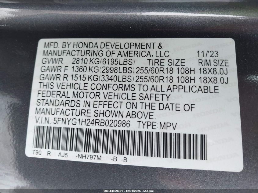 2024 HONDA PILOT 2024 року Бензин, 3.5, Полный привод, vin - 5FNYG1H24RB020986 из США