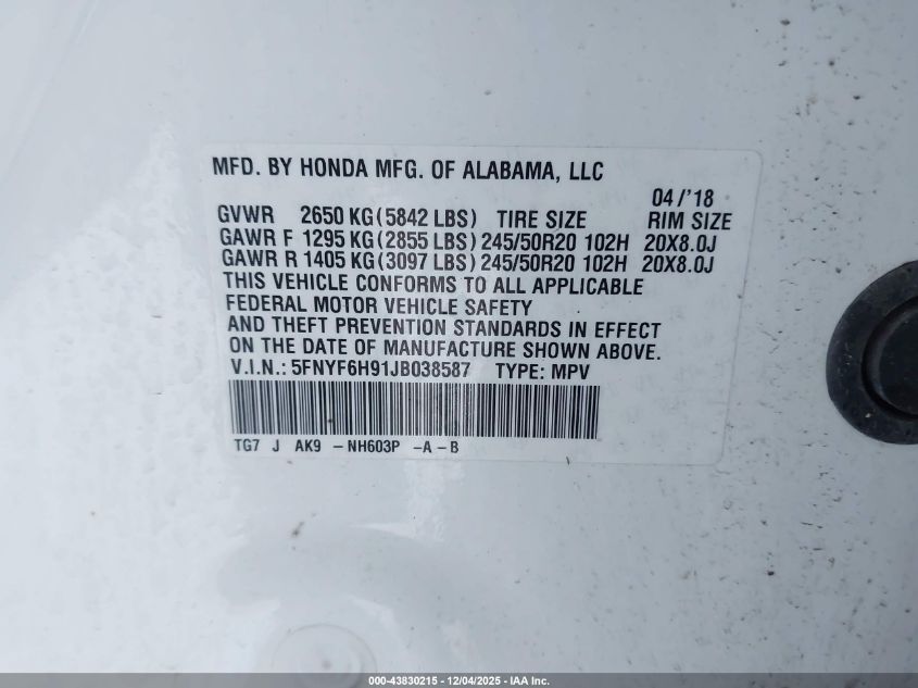 2018 HONDA PILOT 2018 року Бензин, 3.5, Полный привод, vin - 5FNYF6H91JB038587 из США
