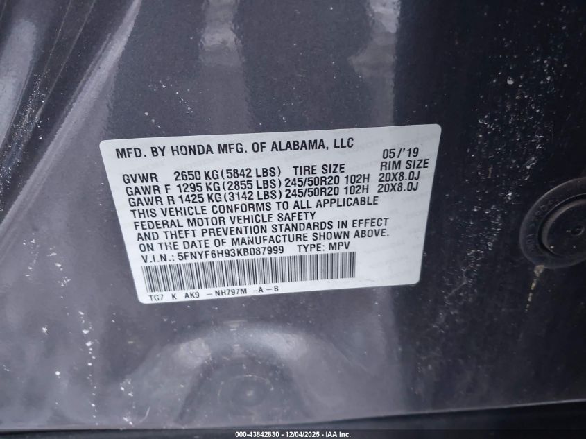 2019 HONDA PILOT 2019 року Бензин, 3.5, Полный привод, vin - 5FNYF6H93KB087999 из США