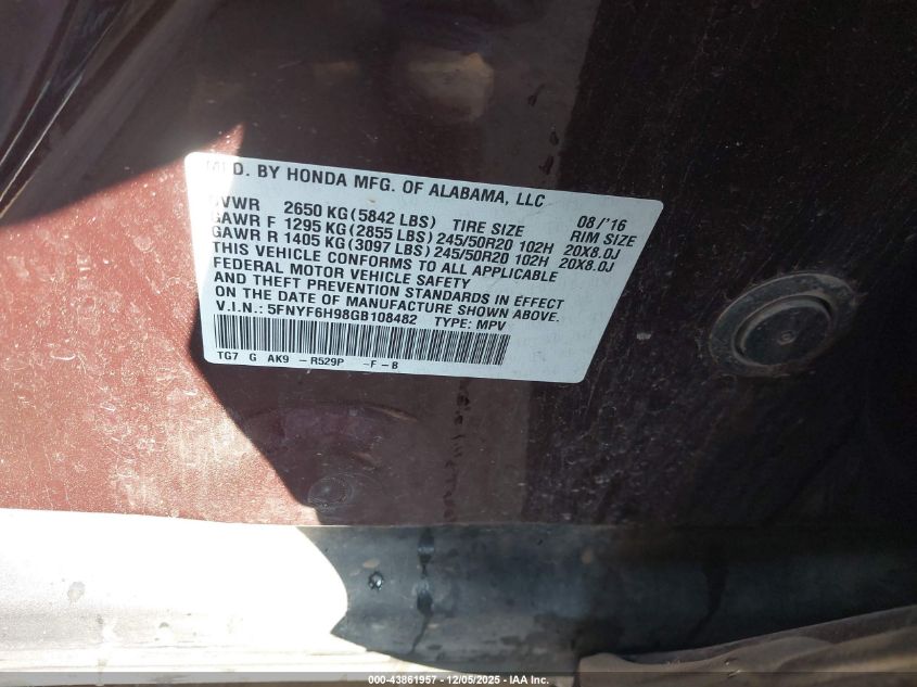 2016 HONDA PILOT 2016 року Бензин, 3.5, Полный привод, vin - 5FNYF6H98GB108482 из США