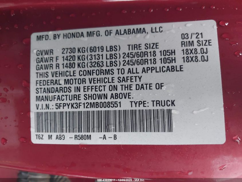 2021 HONDA RIDGELINE 2021 року Бензин, 3.5, Полный привод, vin - 5FPYK3F12MB008551 из США