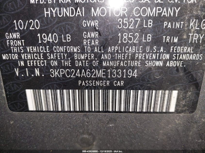 2021 HYUNDAI ACCENT 2021 року Бензин, 1.6, Передний привод, vin - 3KPC24A62ME133194 из США