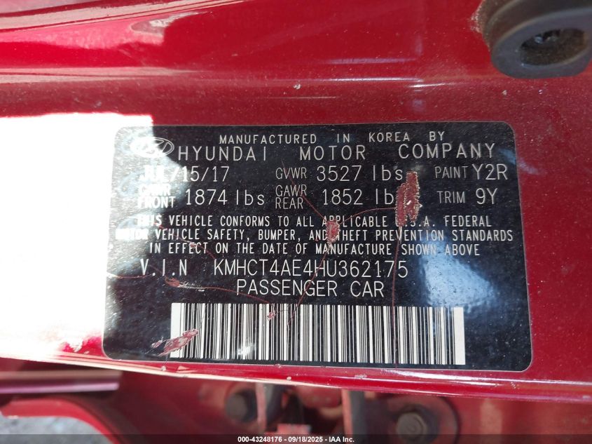 2017 HYUNDAI ACCENT 2017 року Бензин, 1.6, Передний привод, vin - KMHCT4AE4HU362175 из США