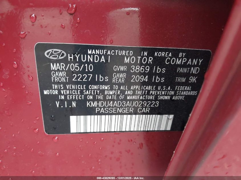 2010 HYUNDAI ELANTRA 2010 року Бензин, 2.0, Передний привод, vin - KMHDU4AD3AU029223 из США