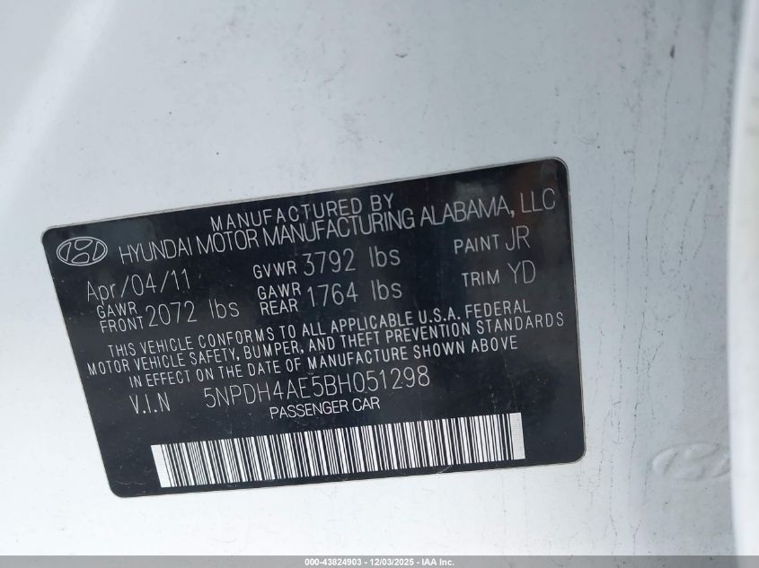 2011 HYUNDAI ELANTRA 2011 року Бензин, 1.8, Передний привод, vin - 5NPDH4AE5BH051298 из США